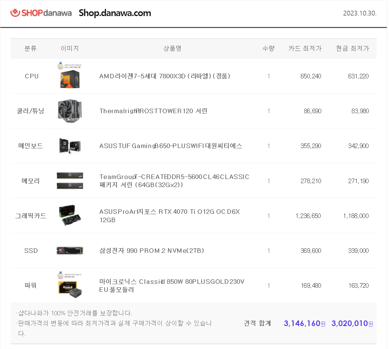 cpu는 11월 알리 광군절때 특가 상품이 떠서 멀티팩 7800x3d 제품을 구입 / 367,000원 (부가세포함 403,700원)